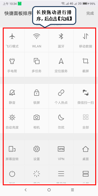 3.根据使用习惯,长按并拖动图标,然后点击【完成】,可自定义位置,如图1-5所示。
