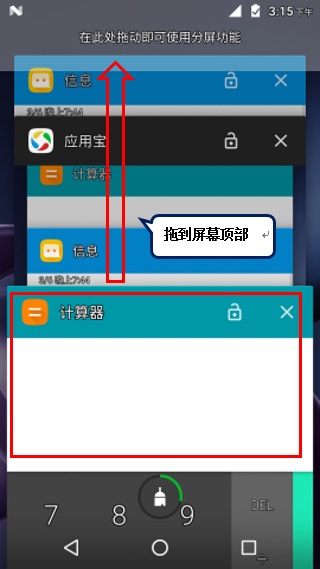 2. 把应用拖到屏幕顶部,应用就会缩放到上半屏幕,如图1-2所示;
