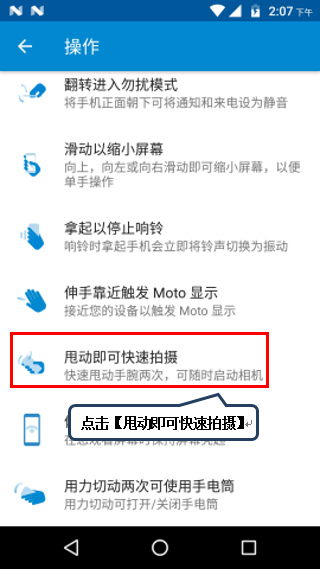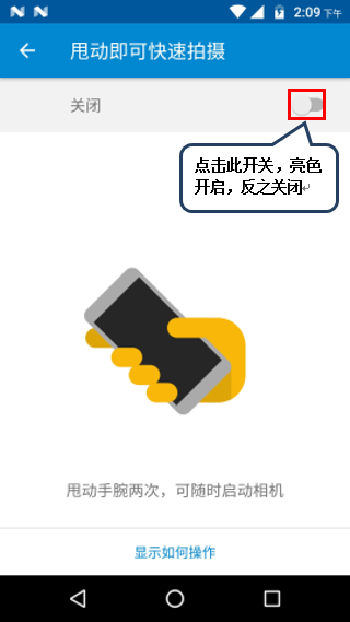 2. 在操作界面,点击【甩动即可快速拍摄】,并点击右侧开关,使之亮色,即可实现快速拍摄(摇晃两下打开取景器,再摇晃两下可切换前后置摄像头),如图1-3至1-4所示。