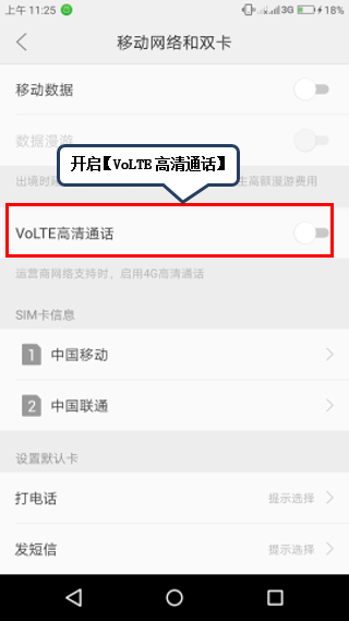 3. 打开【VoLTE高清通话】右侧开关,即可实现在运营商网络支持时,启用4G高清通话,如图1-3所示。