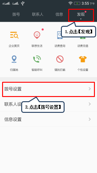 1. 在【待机界面】点击【电话】进入拨号界面,先点击【发现】再点击【拨号设置】,如图1-1至1-2所示;