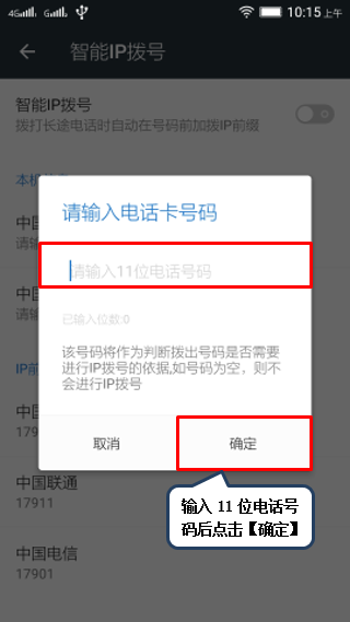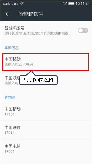 4. 设置本地电话卡的信息,以【中国移动】为例,输入11位电话号码作为判断拨出号码是否需要进行IP拨号的依据,如图1-6至1-7所示;