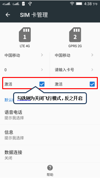 3. 勾选任一张SIM卡【激活】则关闭飞行模式,取消勾选则为开启,如图1-3所示。