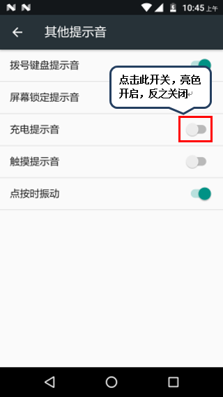 4. 点击【充电提示音】右侧开关,亮色开启,反之关闭,如图1-6所示;