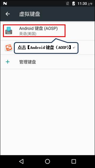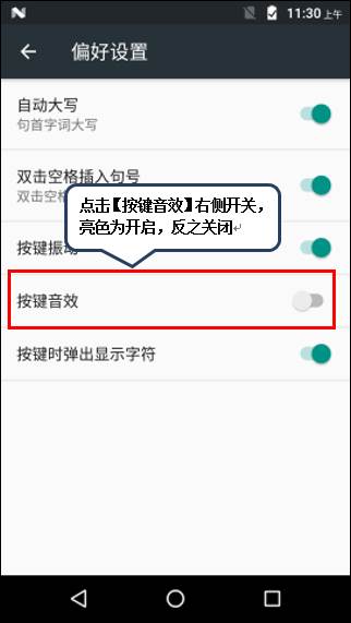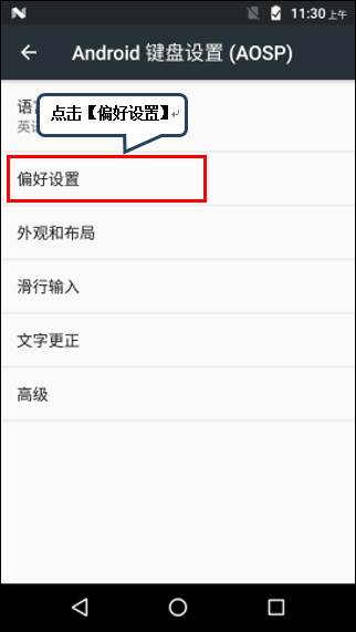 2. 设置Android键盘按键音效:点击【Android键盘(AOSP)】,然后点击【偏好设置】,再点击【按键振动】右侧开关,亮色为开启按键音效功能,反之关闭,如图2-3至2-5所示;