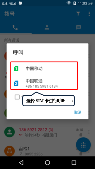 2. 在通话记录界面,点击要回拨的电话号码,选择SIM卡进行呼叫即可,如图1-2至1-3所示;