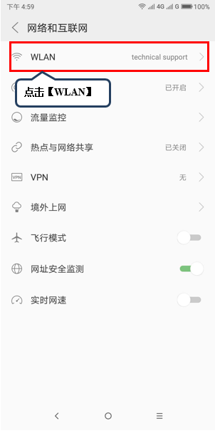 4.在【WLAN】界面点击右侧开关开启WLAN,如图1-4所示;