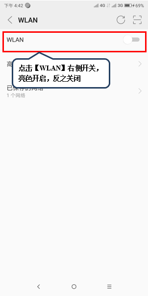 4.在【WLAN】界面点击右侧开关开启WLAN,如图1-4所示;