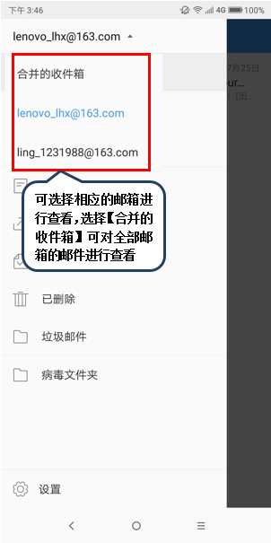 3.点击左上角邮箱账户可进行账户的切换,可选择相应的邮箱账户进行查看邮件,也可选择【合并的收件箱】可对所有账号的邮件进行查看,如图1-3至1-4所示。